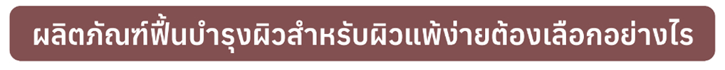 หลายคนอาจจะเข้าใจว่าผลิตภัณฑ์สำหรับผิวแพ้ง่ายต้องบางเบาเท่านั้น จริง ๆ แล้วควรเลือกตามสภาพผิวพื้นฐานของตัวเอง เช่น คนที่ผิวแพ้ง่ายและมีผิวแห้งถึงแห้งมาก ควรเลือกใช้ผลิตภัณฑ์ฟื้นบำรุงผิว และคงความชุ่มชื้นด้วยมอยส์เจอร์ไรเซอร์เนื้อครีมที่เข้มข้น หรือคนที่ผิวแพ้ง่ายที่ผิวมีปัญหาสิว ก็ควรใช้ผลิตภัณฑ์ฟื้นบำรุงควบคู่ไปกับผลิตภัณฑ์ที่ดูแลปัญหาสิว หรือยารักษาสิวร่วมด้วย